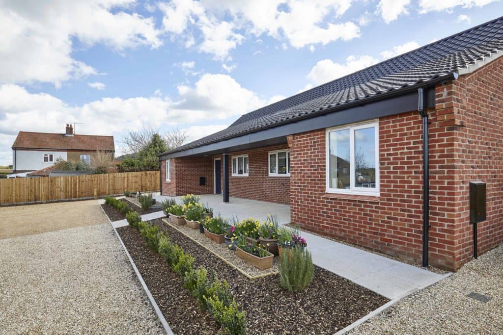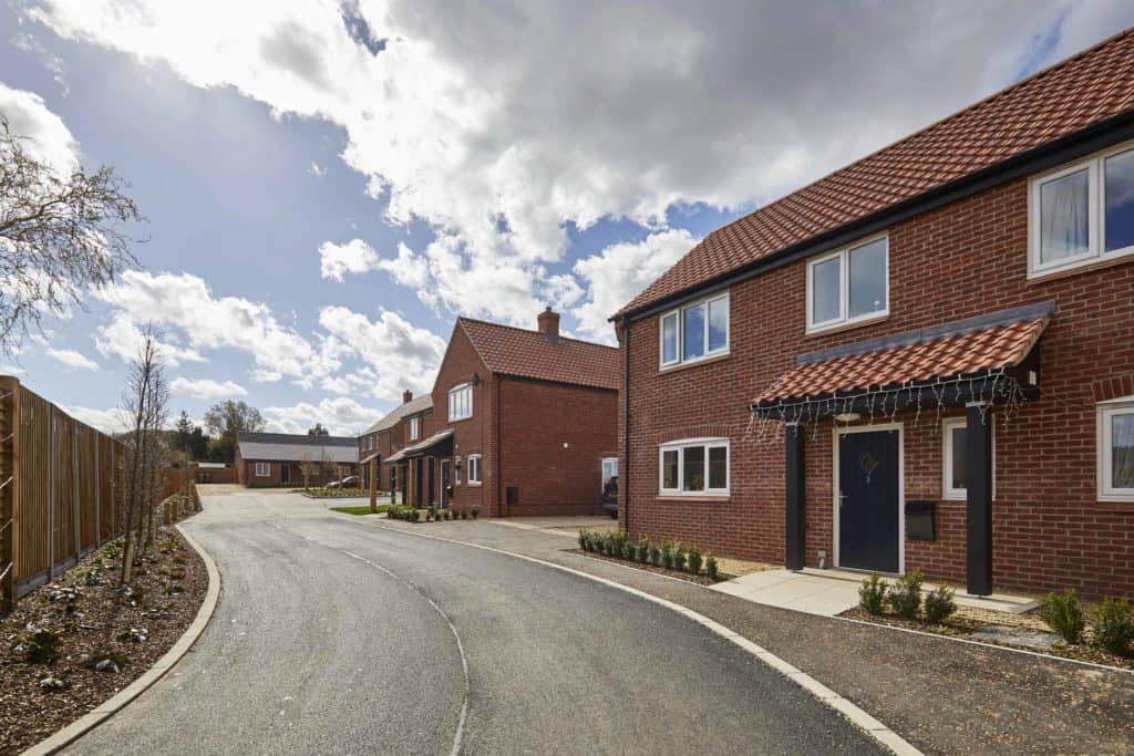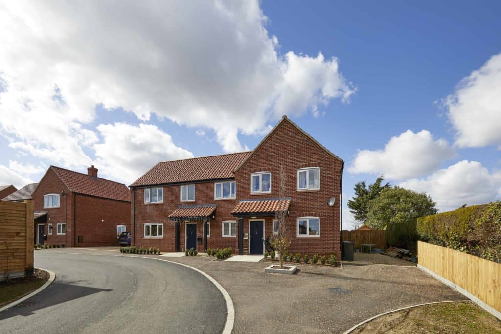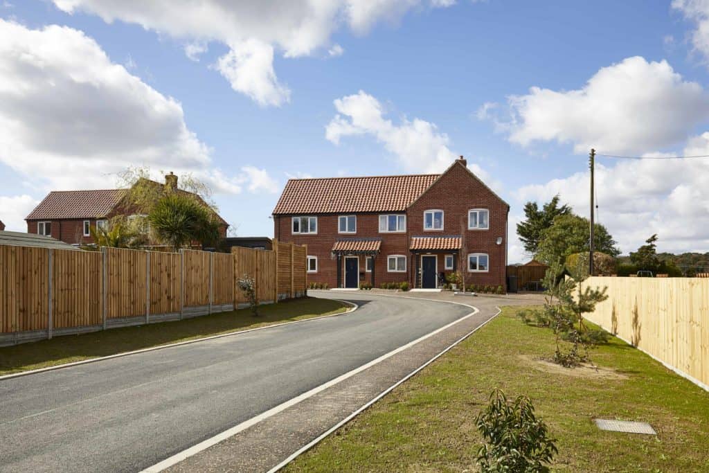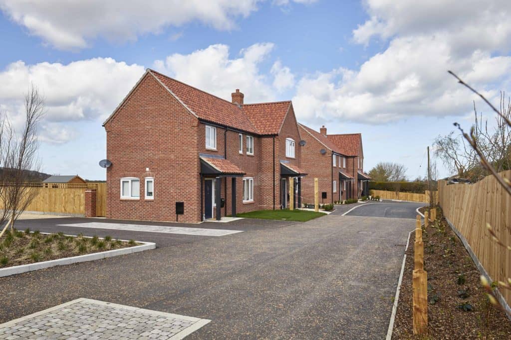 Eight new homes off Blowlands Lane in Sheringham for Broadland Housing Group. Designed by Ingleton Wood and Rossi Long. Heating provided by air source heat pumps. External works specification included conservation kerbs and paving to communal spaces.